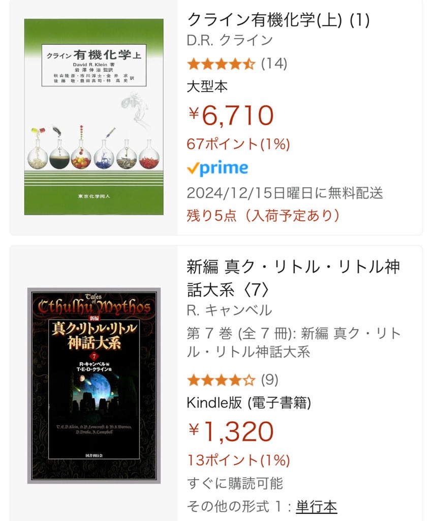 Dr.クラインの英語綴り調べてたら本当にそんな表記の科学者の方が書いた本出てきてついAmazonのページ見てしまったんだけど、サジェストに出てきた作家さんの名前がキャンベルで思わず二度見した。そんな偶然あるのかよ。(参照 )
